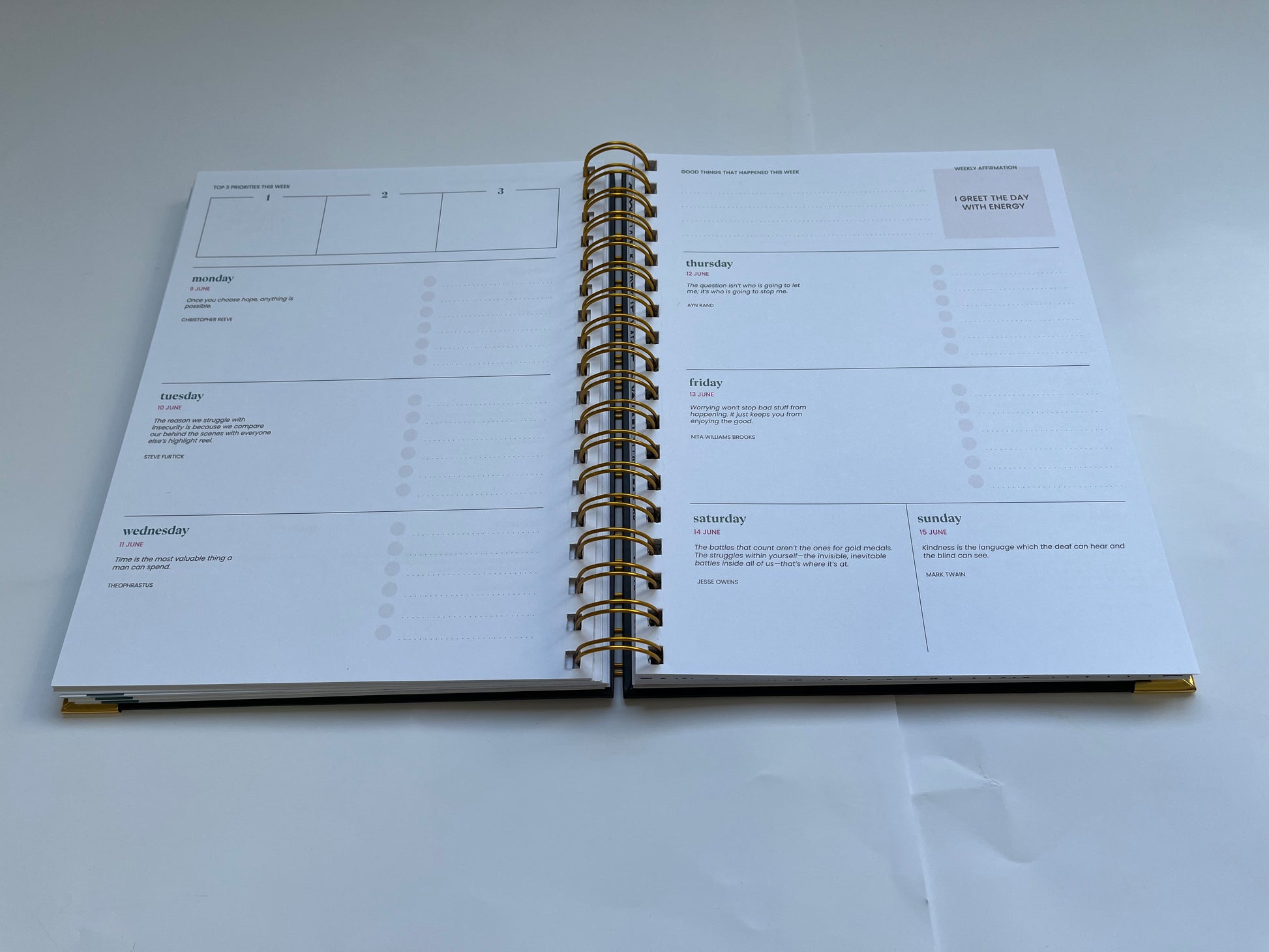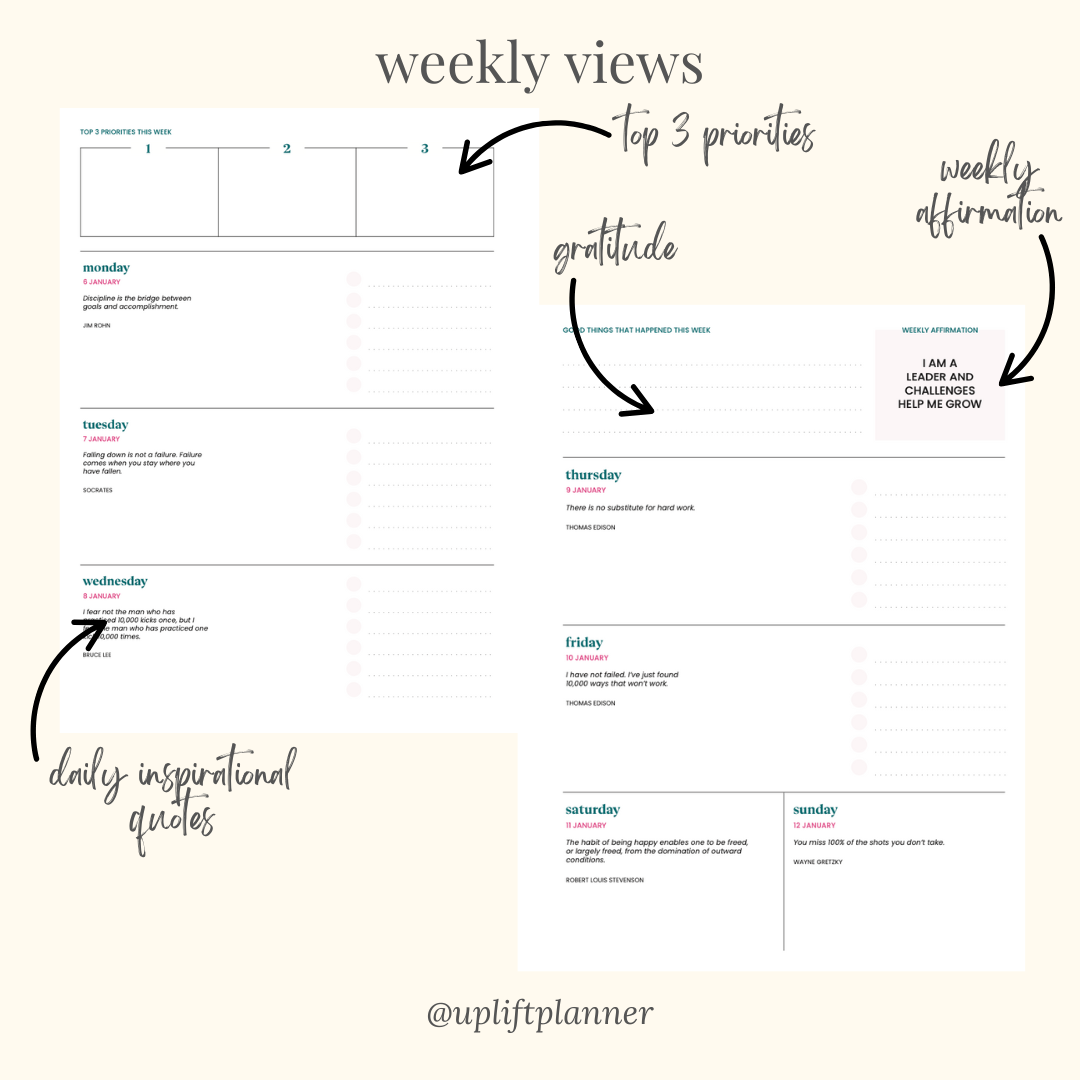 Weekly Spreads include: Quote of the Day, Affirmation of the Week, Good Things That Happened This Week, 3 Priority To-Dos